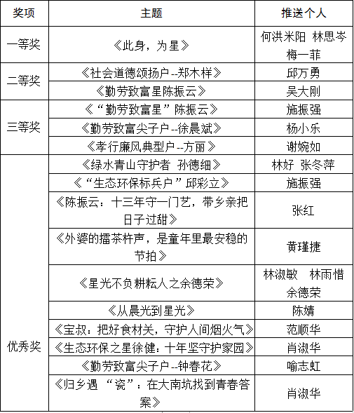 根据《三明市第六届网络文化主题宣传将乐专场活动方案》,将乐县融媒体中心于2025年7月24日在“微将乐”微信公众号发起2025年“我的这颗星”短视频大赛征集活动,活动于2025年9月1日圆满结束。本次征集活动共收到27部作品,经过海选初筛、专家评审等环节,评选出优秀微视频一等奖1名、二等奖2名、三等奖3名,优秀奖10名,现予以公示(具体名单如下)。